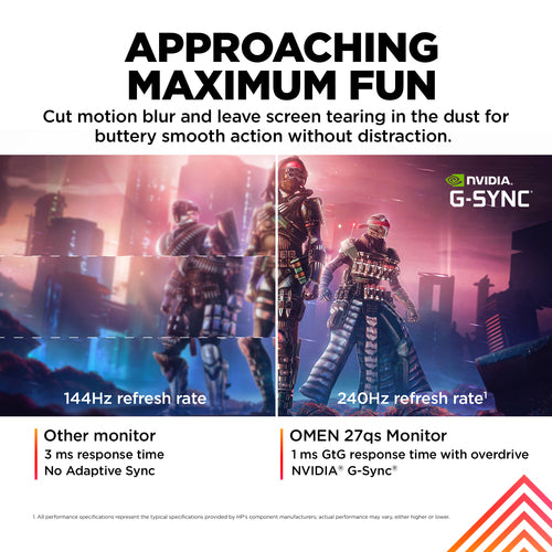 Outclass the competition with the OMEN by HP 27-inch QHD 240Hz Gaming Monitor. Delivering ultra-smooth frames and crisp details[1], this NVIDIA® G-SYNC® compatible display has what it takes to keep up with you. Speed meets looks with a fun, yet refined design unlike any other so you can enjoy it in and out of the game.