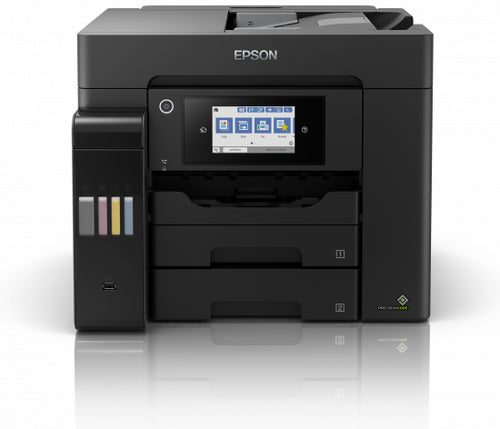 Print, scan, copy and fax will this easy-to-use EcoTank printer, that delivers an exceptionally low cost per page. A4 jobs can be accomplished quickly thanks to fast print and scan speeds, two A4 250-sheet front trays, a 50-sheet rear feed, and a 50-sheet A4 ADF. Print how you like with mobile printing, Ethernet and a 10.9cm LCD touchscreen.